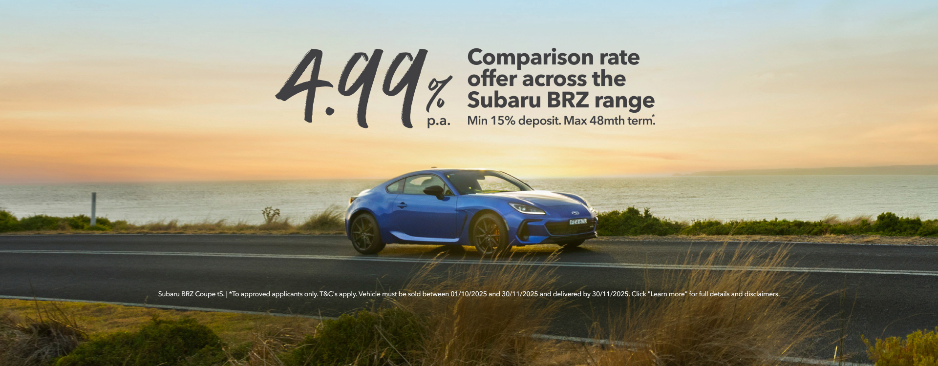 Contact Us*The comparison rate is based on a secured consumer fixed rate loan of $30,000 over a term of 5 years. WARNING: This comparison rate is true only for the examples given and may not include all fees and charges. Different terms, fees or other loan amounts might result in a different comparison rate. Available on MY25 Subaru BRZ new and demonstrator vehicles sold and delivered between 01/10/2025 and 30/11/2025. Minimum deposit of 15% required. Maximum finance term of 48 months applies. Not applicable to loans with balloon payments. Finance to approved applicants only (excluding government, fleet and rental buyers). Finance applications must be approved and settled by 30/11/25. While stock lasts. Credit criteria, fees, charges and terms and conditions apply. Approved applicants only. Finance is provided by IFSA Pty Ltd ABN 39 651 319 774 trading as Subaru Financial Services, managed by Allied Retail Finance Pty Ltd ABN 31 609 859 985 Australian credit licence 483211.
