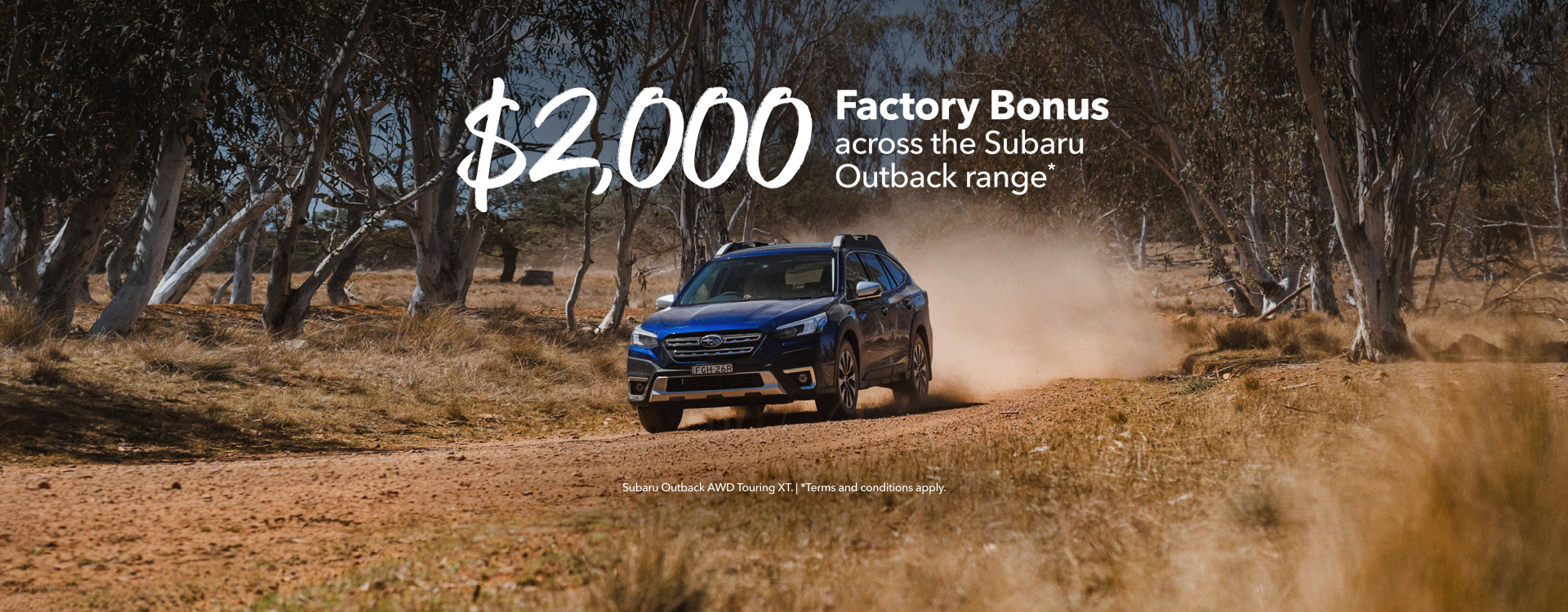 Contact Us*Only available at participating retailers. Applicable to new and demonstrator (used vehicles excluded) Subaru Outback vehicles sold between 01/10/2025 and 30/11/2025; and delivered before 30/11/2025. $2000 Factory Bonus applied at the point of the purchase price of the applicable vehicle. The Factory Bonus is not redeemable for cash, is not transferable and cannot be altered. Not applicable to Fleet, Government or Rental buyers.