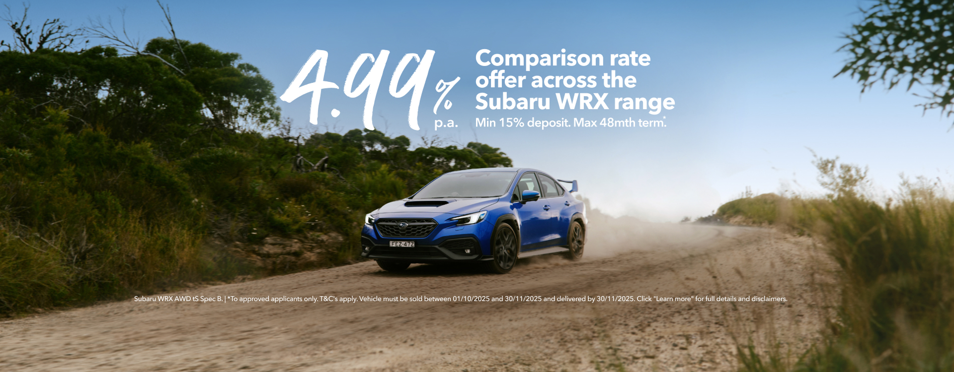 Contact Us*The comparison rate is based on a secured consumer fixed rate loan of $30,000 over a term of 5 years. WARNING: This comparison rate is true only for the examples given and may not include all fees and charges. Different terms, fees or other loan amounts might result in a different comparison rate. Available on MY25 Subaru WRX new and demonstrator vehicles sold and delivered between 01/10/2025 and 30/11/2025. Minimum deposit of 15% required. Maximum finance term of 48 months applies. Not applicable to loans with balloon payments. Finance to approved applicants only (excluding government, fleet and rental buyers). Finance applications must be approved and settled by 30/11/25. While stock lasts. Credit criteria, fees, charges and terms and conditions apply. Approved applicants only. Finance is provided by IFSA Pty Ltd ABN 39 651 319 774 trading as Subaru Financial Services, managed by Allied Retail Finance Pty Ltd ABN 31 609 859 985 Australian credit licence 483211.